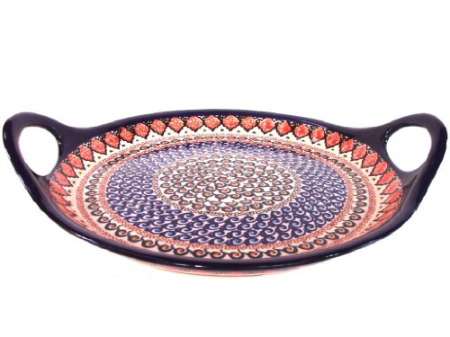 This Round Serving Platter with Handles hand-formed from white clay and baked at 2,246 degrees, which makes it extremely durable and non-porous. It can literally go from the oven to the table to the dishwasher. This pottery piece is hand-made and signed by the artist in Zaklady Ceramiczne - the oldest factory in Boleslawiec, Poland and marked Unikat (unique), which makes it even more valuable!This beautiful dish can be used as a serving platter or tray or as a display item. This lovely multifunctional piece of collectible pottery is always a welcome gift.
