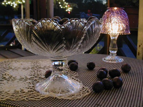 This is such an elegant centerpiece. The crystal colored glass is thick and high quality. The pattern is plume and the piece stands eight inches tall and nine and a half inches wide. Hand made in PA.