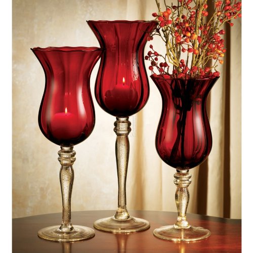 SET OF 3 TOULUSSE RED HURRICANE GLASSES A set of hurricane glasses in deep red with clear stylized stems. Experience the elegantly made tulip-inspired bowls with rims that seem to blossom from them, adding an air of romance and royalty to any home.